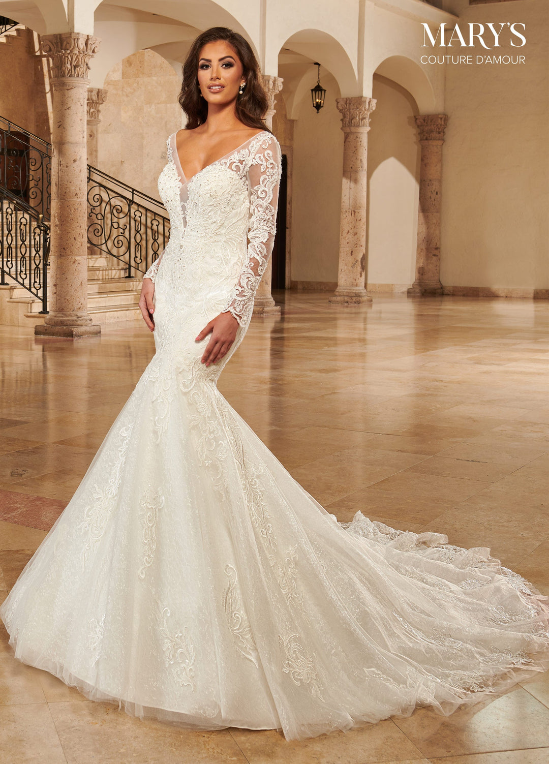 Look unforgettable in this long sleeve wedding dress with mermaid skirt by Mary's Bridal Couture D'amour Collection MB4121. One of a kind tulle wedding/bridal dress with a V-neck neckline, long fitted sleeves, keyhole back, and adjustable straps with lace-up closure. The bodice and skirt have been accented with crystal beaded lace applique, made of shimmering glitter tulle, and a matching lace border at the hem. The gown finishes with a long chapel length train.