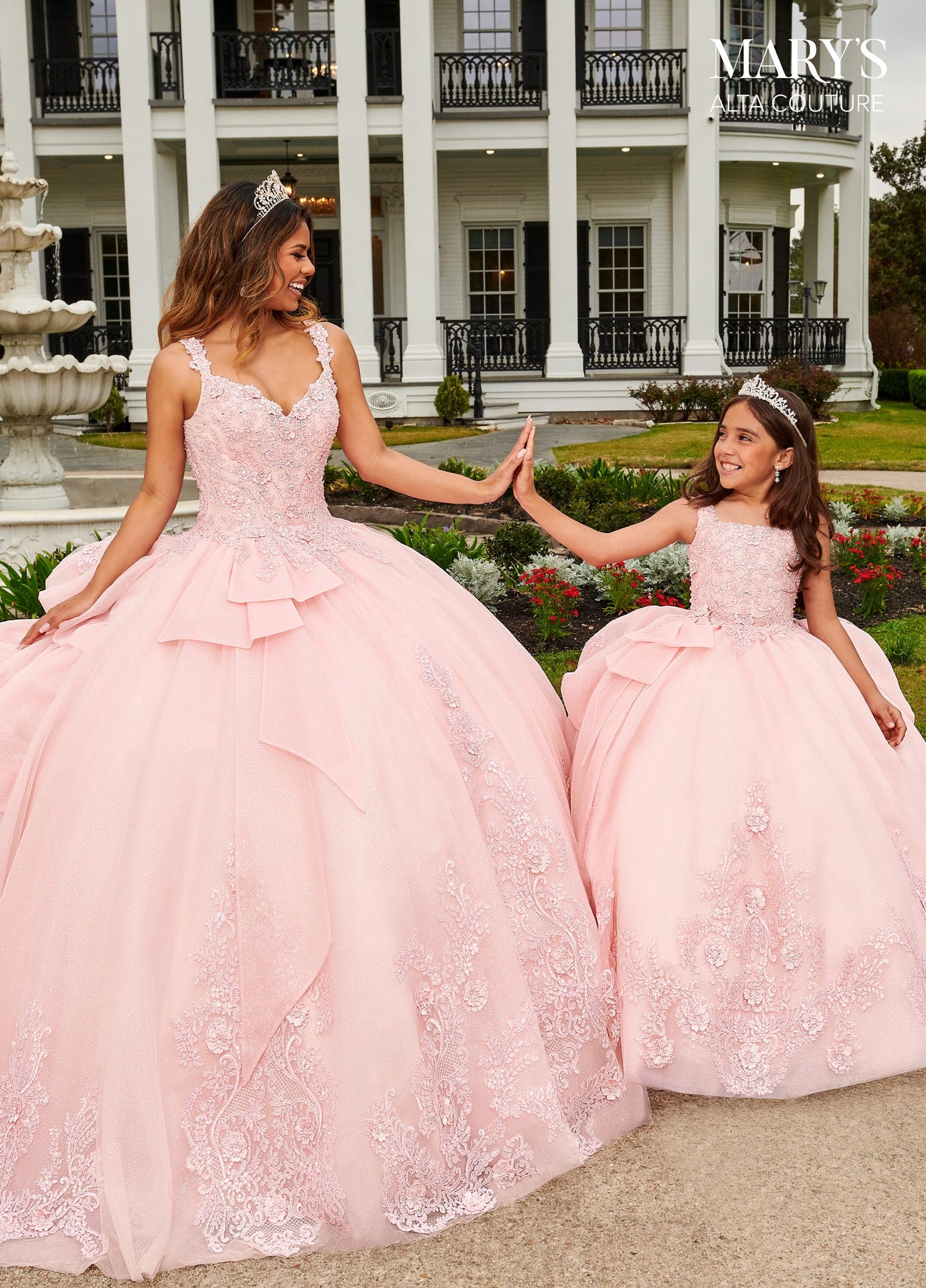 Receive lots of compliments in this 3D floral applique long strapless dress with A-line skirt by Mary's Bridal Alta Couture MQ3092. This glitter tulle ball gown features a sweetheart neck line, beading detail, lace applique, 3D flowers, detachable bow, and back with lace-up closure, tiered bubble skirt, and sweep train. Matching Mini Quince is available as style MQ4036.