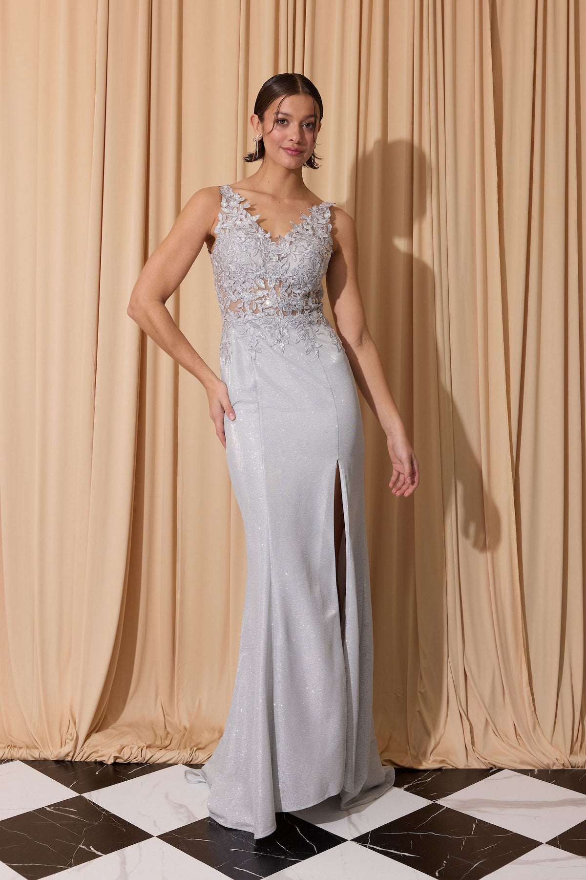 - Applique Metallic V-Neck Slit Gown by Eureka 9810