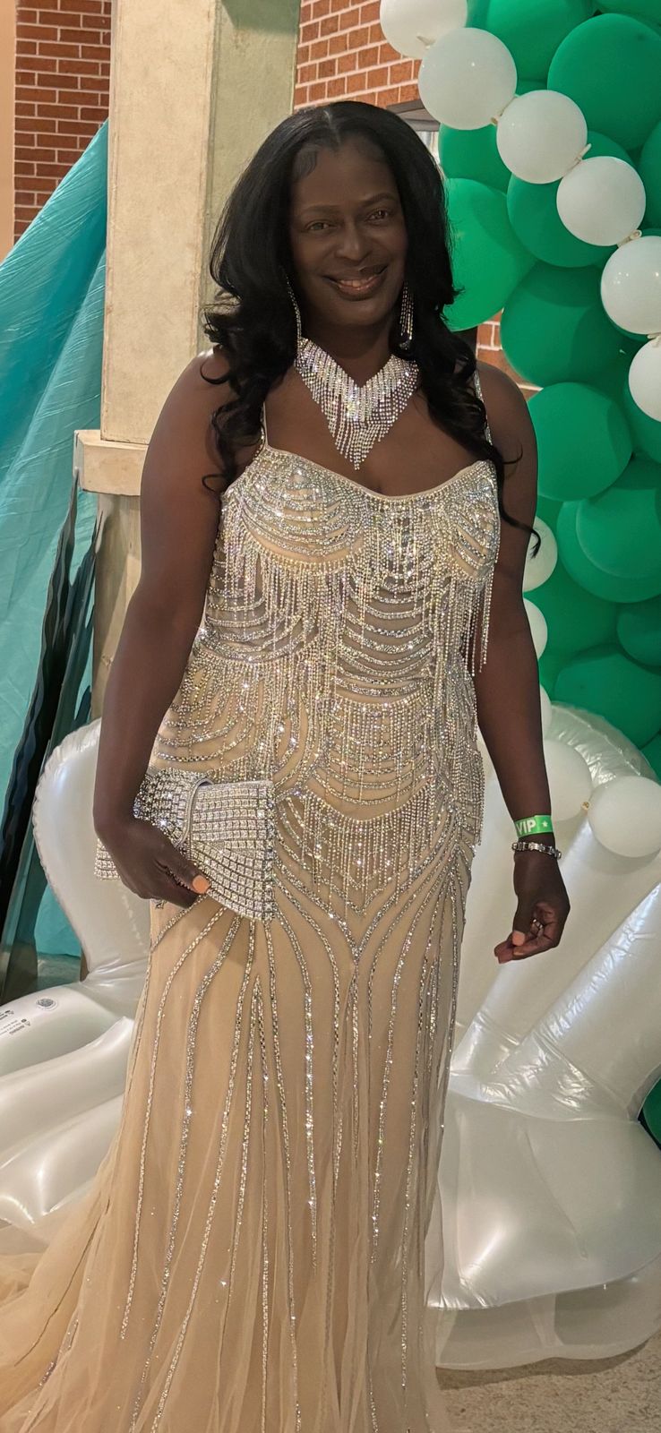 Dazzle the room in this beaded long sleeveless fringe dress with fitted mermaid skirt from Ladivine by Cinderella Divine CD866. Turn heads and make a statement in this stunning fringe embellished mermaid gown. The fitted mermaid silhouette gives it an exquisite hourglass shape that will make you feel both glamorous and sophisticated. The gorgeous silver embellished tulle overlay ensures sparkle while the nude lining underlines your figure. Further embellishments adorn the scoop neckline with thin straps, while dangling fringe rhinestone details add a glimmer of light to your look.