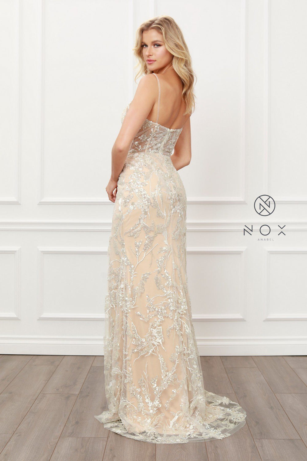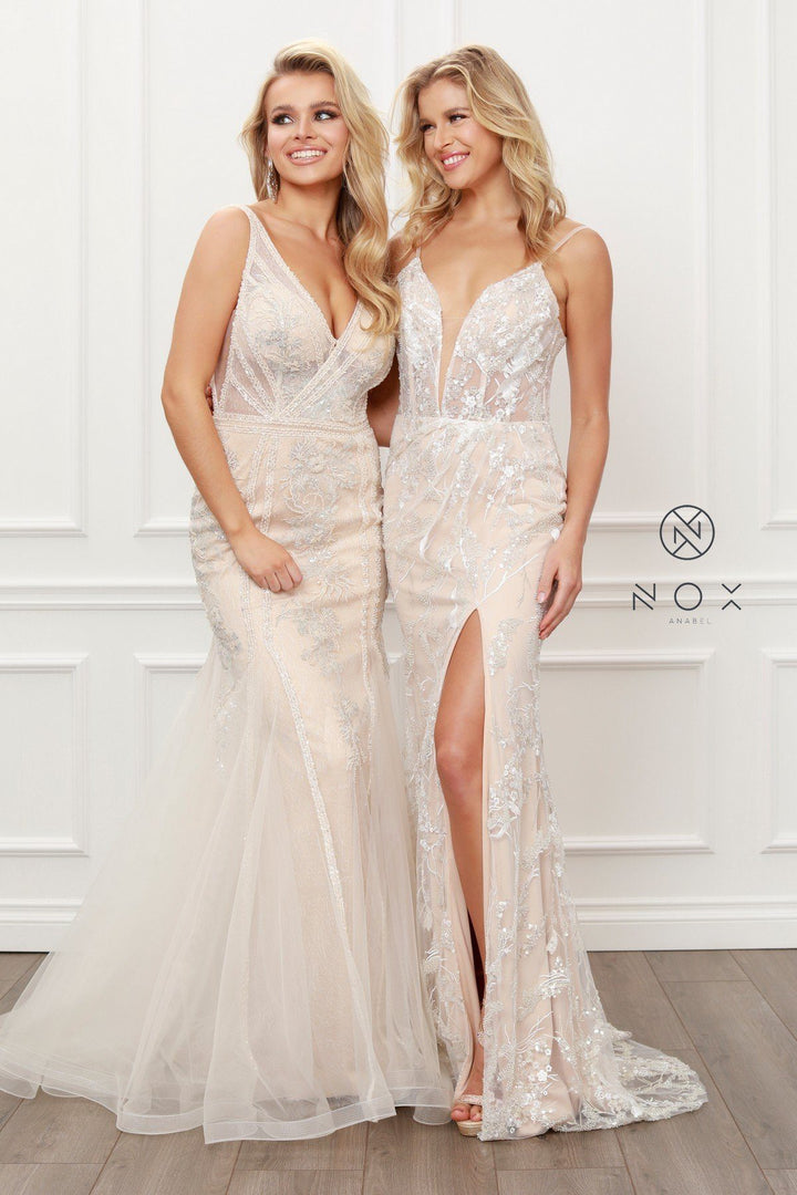 Fitted Sequin Applique Slit Gown by Nox Anabel E459