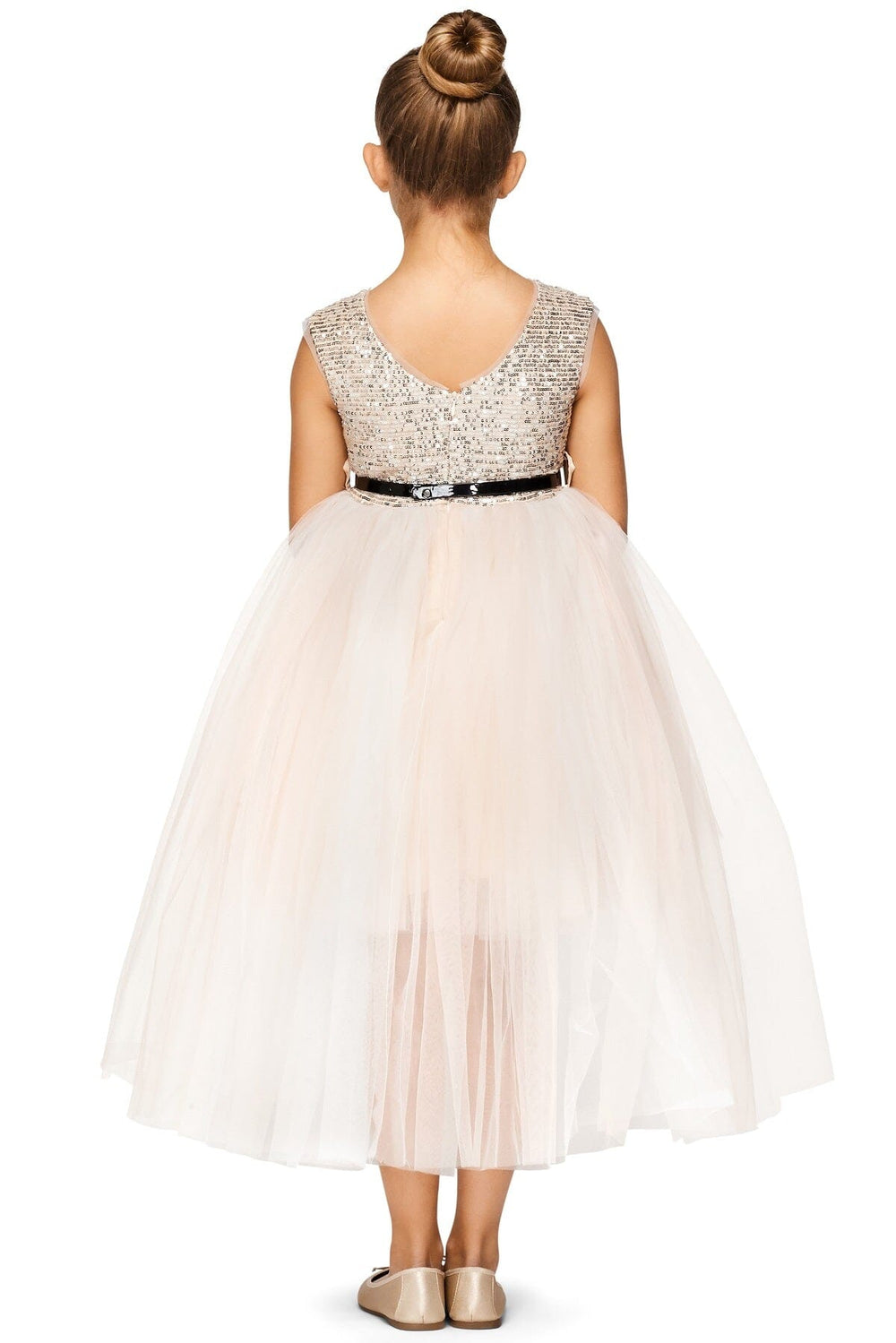 Your sweet girl will light up the room in this sequined bodice sleeveless high low dress with A-line tulle skirt by Cinderella Couture 5098. Cute sequin hi low dress with flowers, two tone rhinestones and pearls, tulle biased for comfort fit, black belt accent.