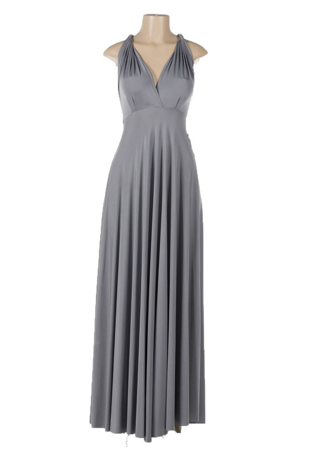 This versatile long gray convertible jersey dress by Poly USA Style Number 7022 is a must-have for your wardrobe. This convertible dress features a beautiful fitted bodice, elegant floor-length skirt, and long straps that gives you more than 20 different beautiful looks. Affordably priced under $100, this versatile long evening gown is perfect for bridesmaids, formal parties, and for prom dances!