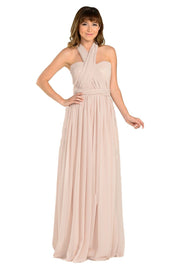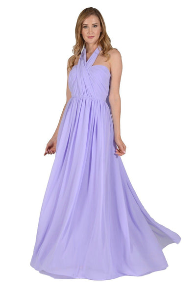 This versatile long lilac convertible chiffon dress by Poly USA Style Number 7156 is a must-have for your wardrobe. This convertible dress features a beautiful pleated bodice, elegant floor-length skirt, and a side zipper closure. This gown has long panels that come from the waistline and can be artfully wrapped and tied over the bodice to create more than 10 different elegant looks. Affordably priced under $150, this versatile long evening gown is perfect for bridesmaids, formal parties, and for prom dances!