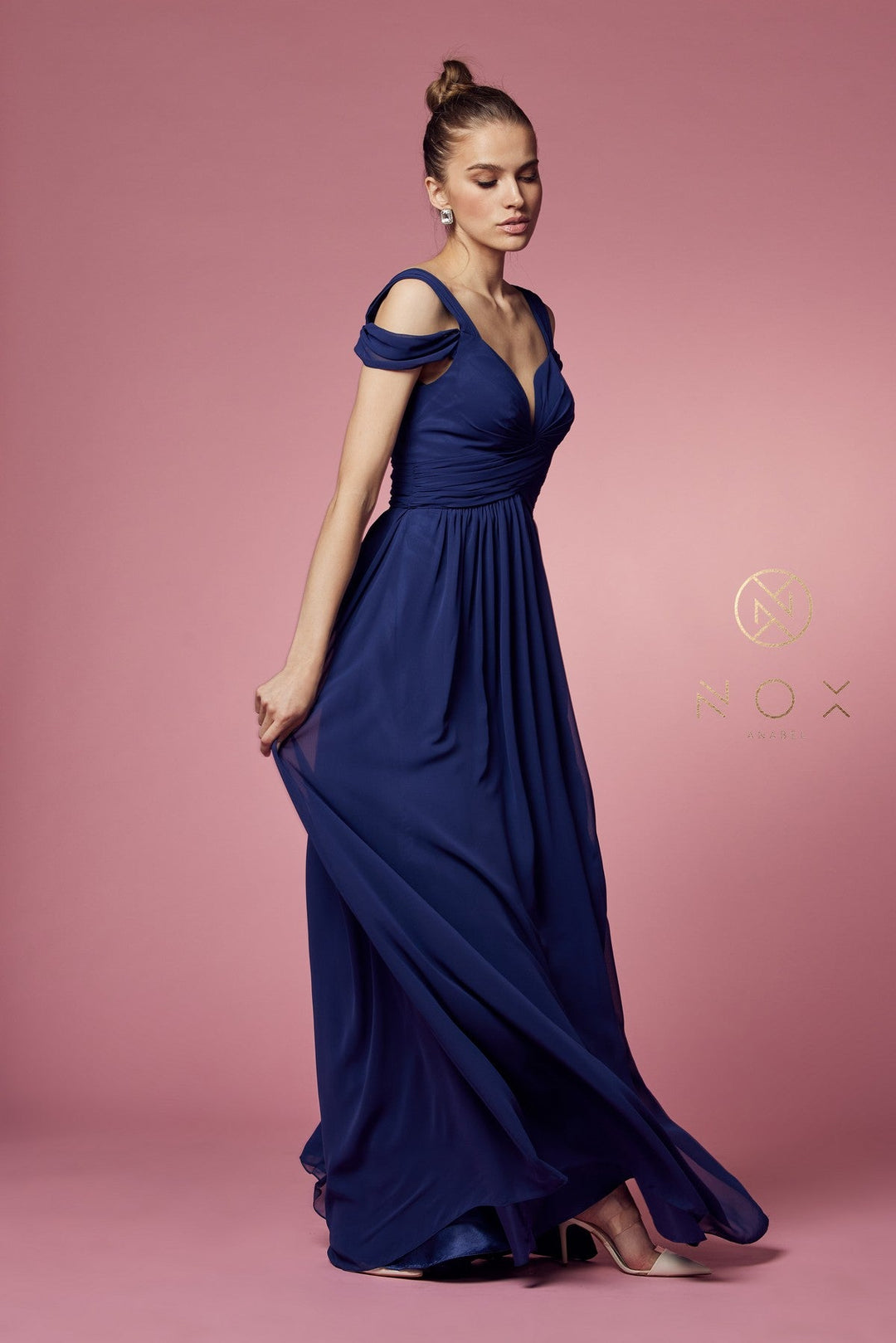 Enjoy your evening in this long A-line off the shoulder dress with leg slit by Nox Anabel Y277.