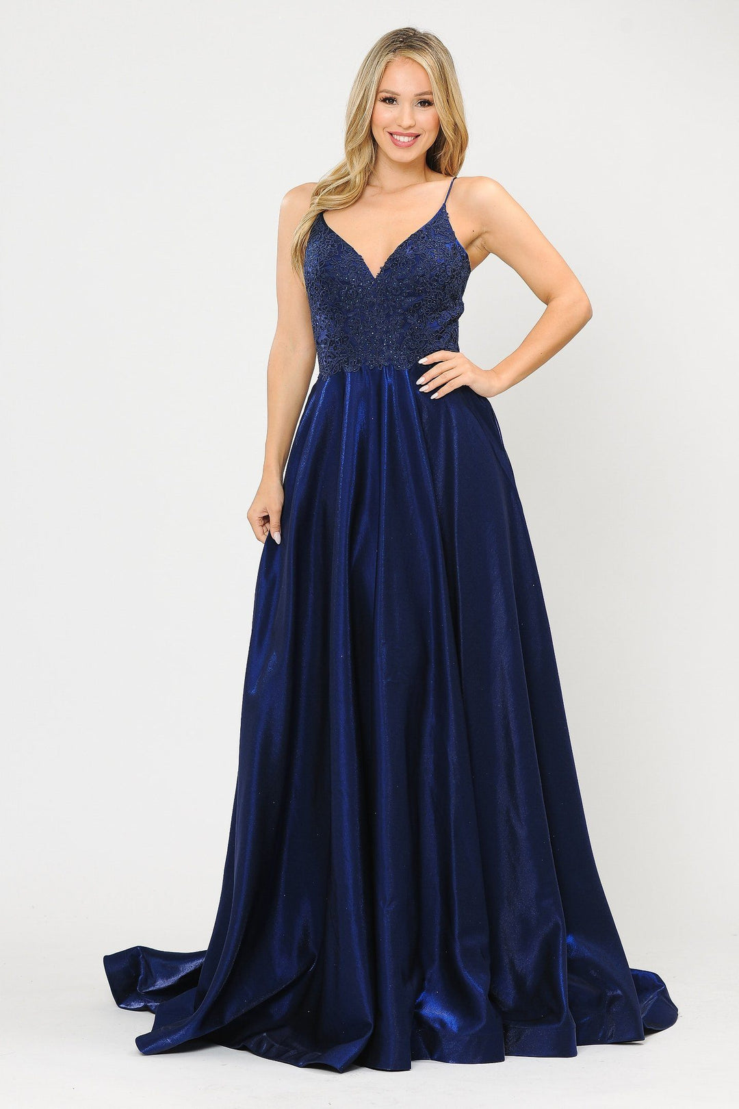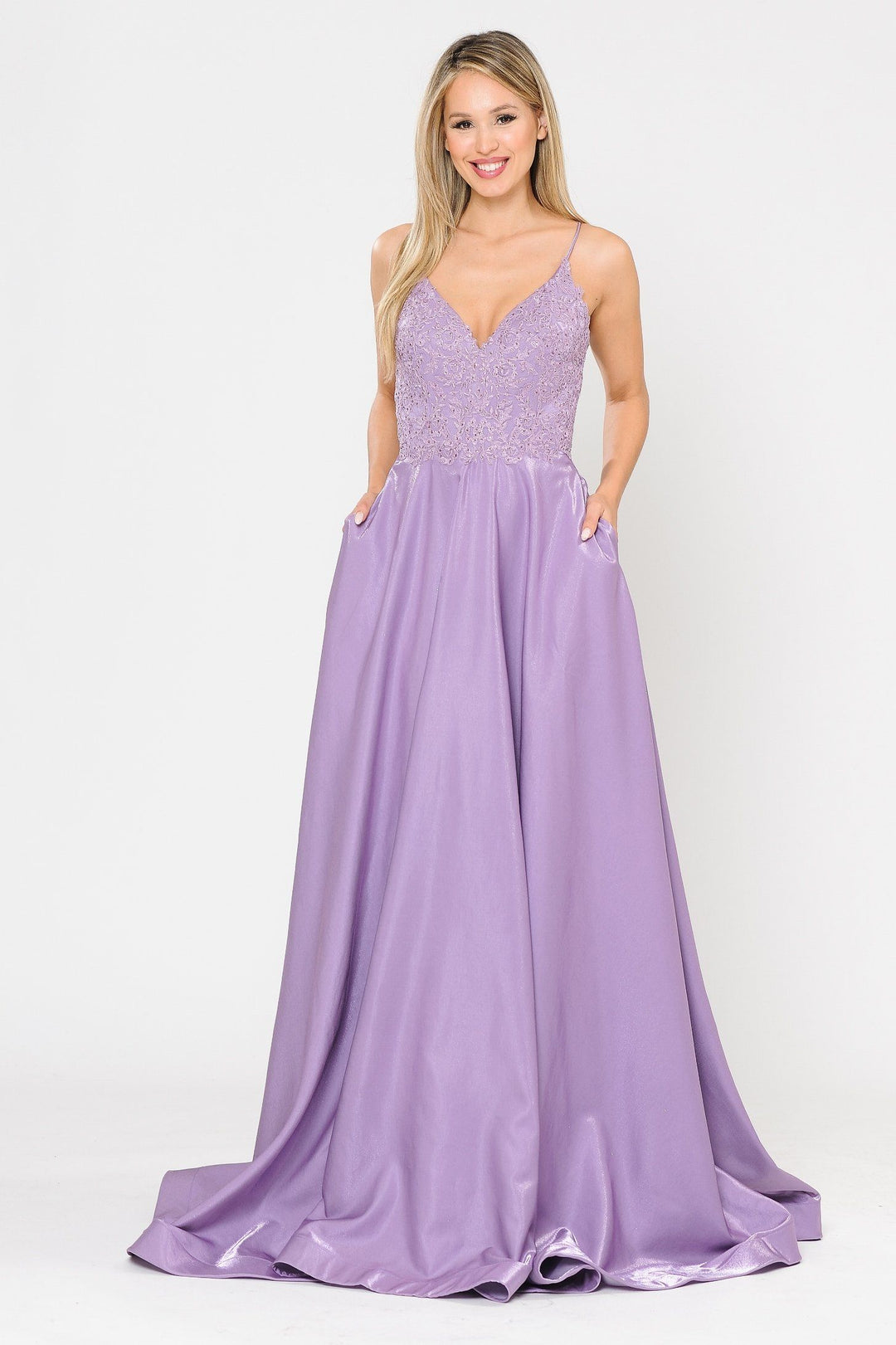 Be red carpet ready in this long satin A-line dress with embroidered lace V-neck bodice by Poly USA 8670. This beautiful formal gown features a sleeveless V-neck lace applique bodice secured with spaghetti straps, flirty crisscross open corset back, side pockets, floor length A-line skirt with a sweep train, and a lace-up back. Affordably priced under $300, this long evening dress is perfect for any formal event and will keep you on budget!