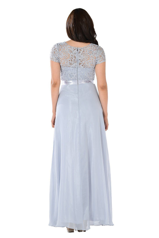 Look sophisticated in this long navy blue dress with short-sleeved lace bodice by Poly USA Style Number 7592. This long evening dress features a lovely lace bodice with short sleeves. An eye-catching gathered skirt, satin waistband, a full-length chiffon skirt, and a zipper closure complete this beautiful look. Perfect as a mother of the bride dress or for any formal event!