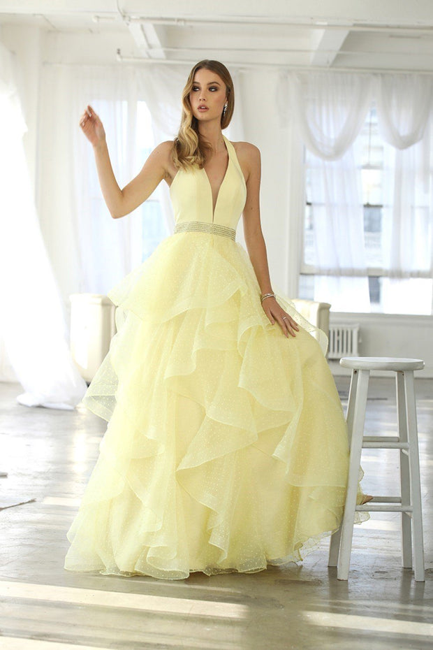 Look radiant in this long V-neck halter dress with dotted tiered skirt by Nox Anabel T256. This beautiful gown features a plunging sweetheart neckline with sheer inset detail. Highlights an open back and layered dotted layered mesh skirt. Beaded design accent around the waistline.