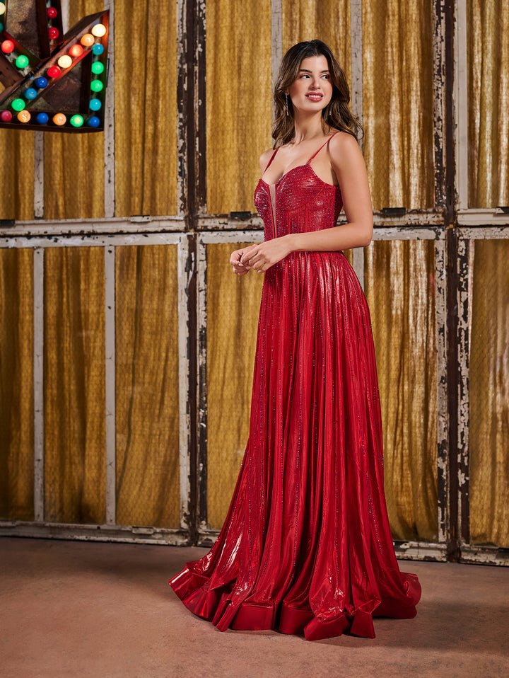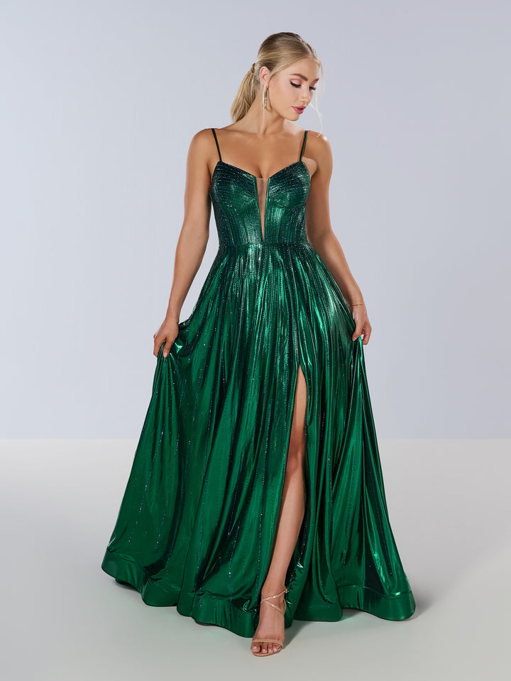 Look like a fairy-tale Princess in this metallic long sleeveless dress with an A-line slit skirt by Tiffany Designs 16189. Flawless spaghetti strap V-neck, A-line gown made out of gorgeous rhinestone embedded lamé jersey material with a sweep train.